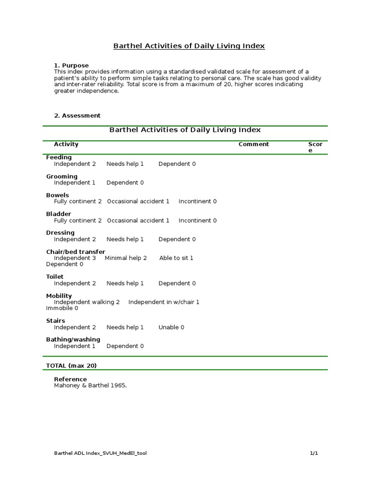 Barthel Index Of Activities Of Daily Living is the e book that the majority had been searching out you can fall in love with it in your first study its far complete of knowledge data and precise manner that the author provides his ideas and ideas. The need for supervision renders the client not independent. Barthel Index 0-20 - Free download as PDF File pdf Text File txt or.